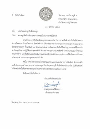 วันนี้อาตมาจึงนำเอกสารคำสั่งของเจ้าอาวาสที่ให้พระรูปนี้กลับไปชี้แจง ซึ่งทาง จะต้องขึ้นทะเบียน สำนักพระพุทธศาสนาจังหวัดนครปฐมได้รวบรวมข้อมูลหลักฐานเพื่อรายงานต่อเจ้าคณะจังหวัดสุพรรณบุรีต่อไป โดยให้ระยะเวลาภายในเจ็ดวันซึ่งที่ผ่านมาตั้งแต่ปี 2562 ประชาชนได้ร้องเรียน พระรูปนี้มายังอาตมาตลอด เช่น การนำบุคคลต่างด้าวไปอยู่