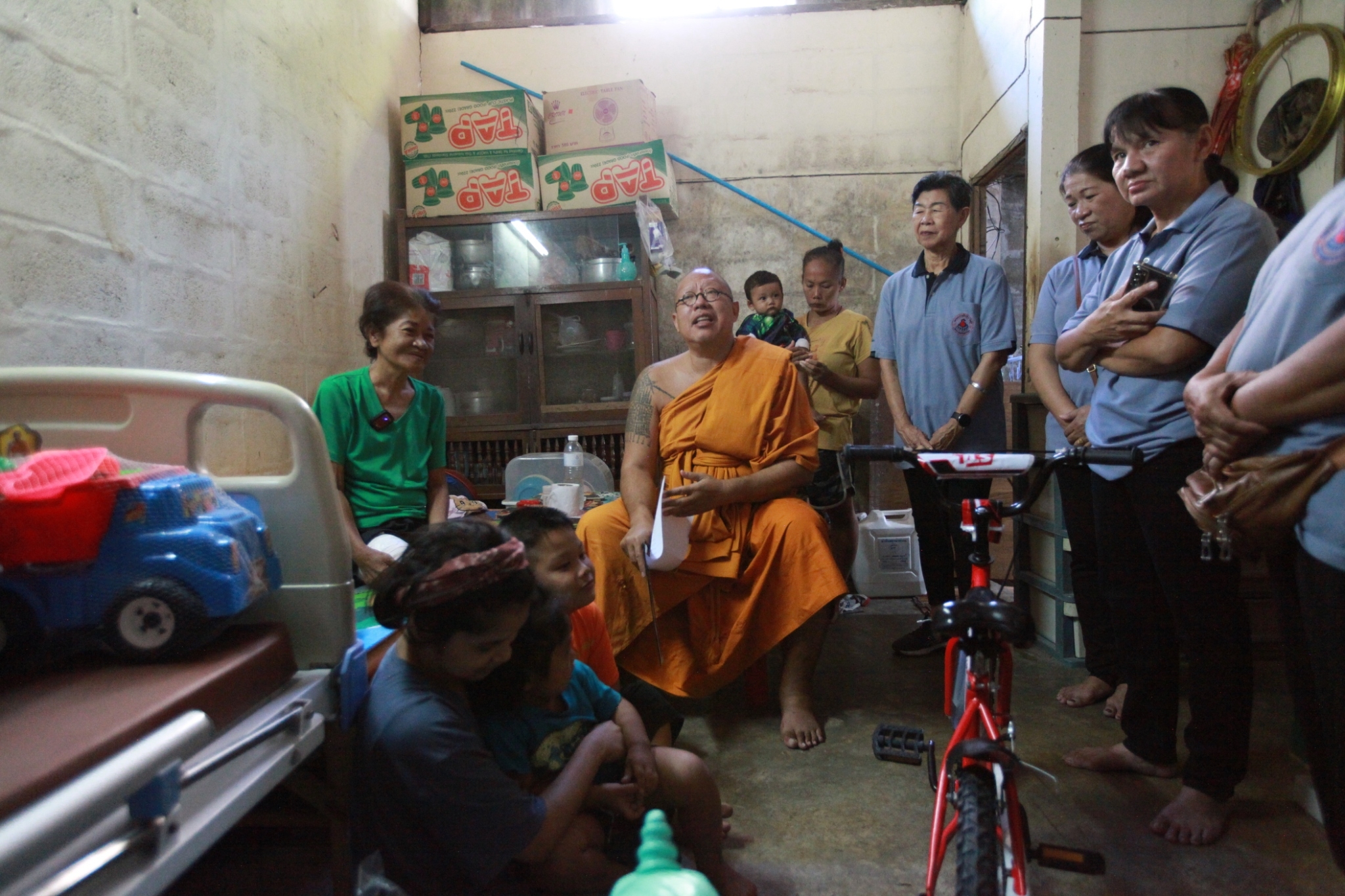 หลวงพี่น้ำฝน ไม่รอเวลาทราบข่าวอดีต อสม.ป่วยหวานถูกตัดขาไร้งาน อาศัยในบ้านกลางเมืองนครปฐม ร่วมกับลูกสาวพิการเดินไม่ได้ พร้อมคนในบ้านอยู่รวมกัน 7 ชีวิต ต้องการเตียงสำหรับผู้ป่วย ให้กำลังใจรีบจัดเตียงส่งถึงบ้านทันที อึ้งเข้าไปพบลูกสาวพิการเดินไม่ได้ตั้งแต่กำเนิด ต้องใช้แขนเดินแทนเท้า รีบประสานแพทย์โรงพยาบาลนครปฐม เข้าให้การช่วยเหลือให้ความรู้การมีผู้พิการในบ้าน 2 คน ที่มีหัวเรือหารายได้เพียงคนเดียวต้องอยู่อย่างไร พร้อมดำเนินการให้วัดไผ่ล้อมเป็นศูนย์กลางกระสานความเดือดร้อนของญาติโยม