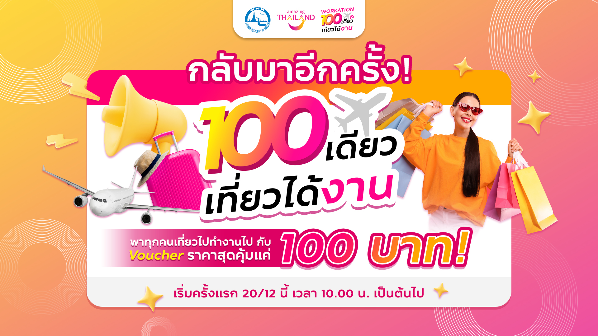 การท่องเที่ยวแห่งประเทศไทย (ททท.) จัดเต็มอีกครั้งกับแคมเปญกระตุ้นการท่องเที่ยวในรูปแบบ Workation ที่ส่งเสริมการออกเดินทางท่องเที่ยวพร้อมทำงาน เพื่อสร้างประสบการณ์การทำงานในรูปแบบใหม่และก่อเกิดการเดินทางท่องเที่ยวในช่วงปลายปีจนถึงช่วงต้นปี ซึ่งถือเป็นช่วงฤดูท่องเที่ยว (High Season) ผ่านกิจกรรมส่งเสริมการขาย “100 เดียวเที่ยวได้งาน” ซึ่งเป็นกิจกรรมที่ส่งเสริมการตลาดและกระตุ้นการใช้จ่ายของนักท่องเที่ยว เพื่อก่อเกิดการเดินทางท่องเที่ยวภายในประเทศช่วงวันธรรมดา โดยนำเสนอสินค้าและการบริการด้านการท่องเที่ยวในรูปแบบบัตรกำนัล (Voucher) ซึ่งจะเสนอขายในราคาเพียง 100 บาท เท่านั้น