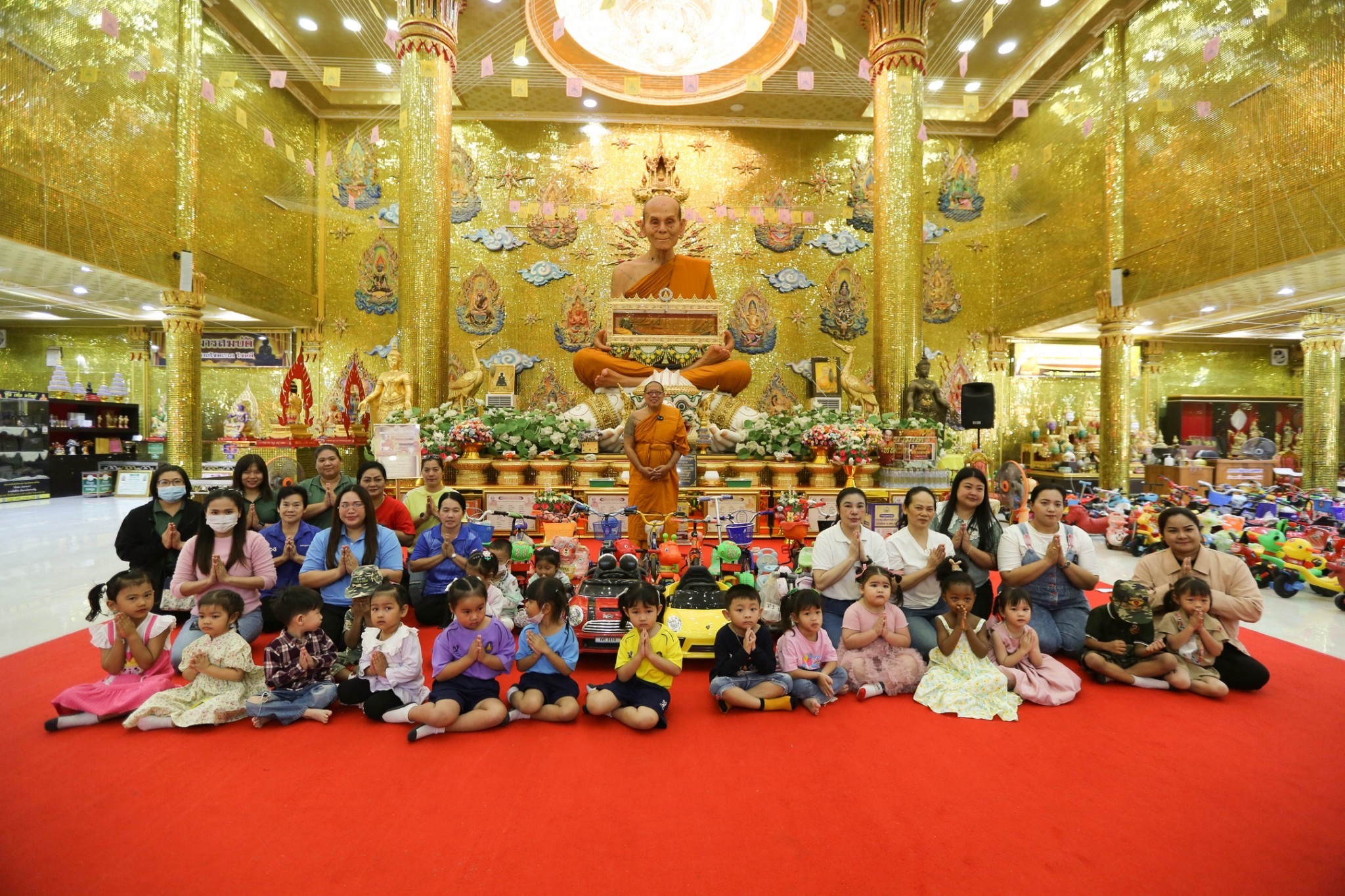 6. ศูนย์พัฒนาเด็กเหล่ากาชาด 7. ศูนย์พัฒนาเด็กปฐมนคร 8. ศูนย์อบรมเด็กก่อนเกณฑ์วัดพระปฐมเจดีย์ โดยมีผู้อำนวยการศูนย์พัฒนาเด็กเล็กและครูผู้สอน น้องๆหนูๆ ชายหญิง อายุประมาณ 3-5 ขวบ เข้ามาทำร่วมรับมอบเพื่อนำไปใช้ในศูนย์พัฒนาเด็กเล็กทุกแห่ง ซึ่งบรรยากาศเป็นไปด้วยความสนุกสนานของน้อง ๆ ที่ได้มาเห็นของเล่นอยู่ตรงหน้าเต็มห้องโถงหน้าประติมากรรมที่บรรจุสรีรสังขารหลวงพ่อพูล