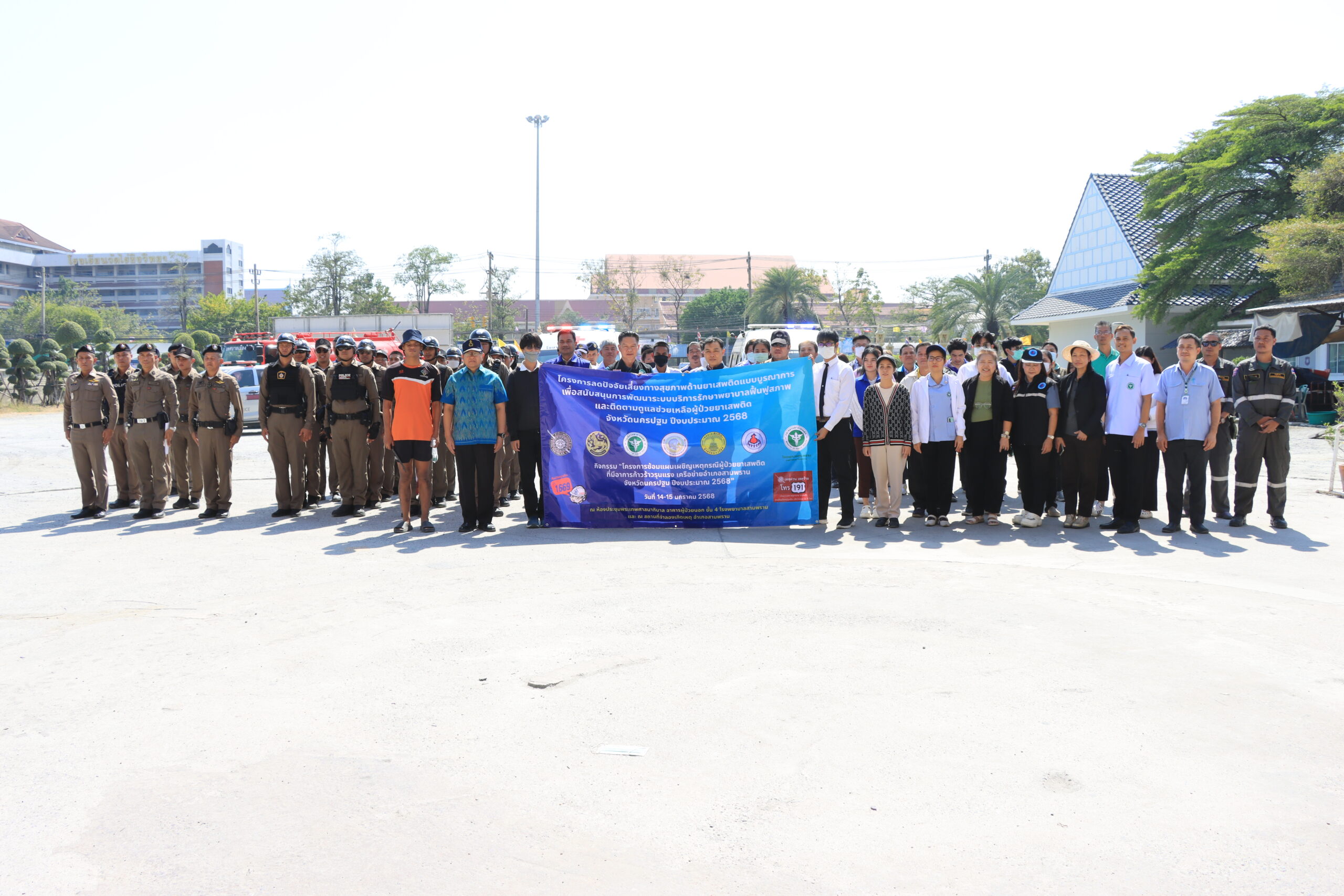 โดยกลุ่มงานจิตเวชและยาเสพติด โรงพยาบาลสามพราน จำลองสถานการณ์ กรณีผู้ป่วยยาเสพติดมีอาการคลุ้มคลั่งใช้อาวุธจับตัวประกัน และมีพฤติกรรมก้าวร้าว ด่าทอ เสียงดัง ซึ่งผู้ป่วยจิตเวชมีประวัติใช้สารเสพติด รักษาไม่ต่อเนื่อง ทีมตำรวจเข้าไกล่เกลี่ย เจรจาต่อรอง แต่เจรจาต่อรองไม่สำเร็จ ผู้ป่วยยังไม่สงบ ทีมตำรวจใช้อุปกรณ์ปืนไฟฟ้ายิงควบคุมสถานการณ์ พร้อมอุปกรณ์ไม้ง่ามเข้าควบคุมตัวตามยุทธวิธี ทีมกู้ชีพเทศบาลเมืองไร่ขิง เจ้าหน้าที่โรงพยาบาลสามพราน เข้าจำกัดพฤติกรรมผู้ป่วย นำส่งโรงพยาบาลสามพราน และนำตัวประกัน ส่งตัวตรวจร่างกายที่โรงพยาบาลสามพราน