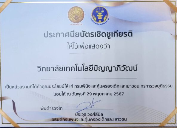 จากนั้น พันตำรวจโท ประวุธ วงศ์สีนิล อธิบดีกรมพินิจและคุ้มครองเด็กและเยาวชน เป็นประธานมอบประกาศนียบัตรเชิดชูเกียรติให้กับเครือข่ายที่ร่วมสนับสนุนภารกิจของกรมพินิจและคุ้มครองเด็กและเยาวชนในการดูแลเด็กและเยาวชนที่เป็นกลุ่มเสี่ยงในสังคม รวมถึงเด็กและเยาวชนที่เข้าสู่กระบวนการยุติธรรม ช่วยทำให้เด็กและเยาวชนเหล่านี้กลับไปใช้ชีวิตในสังคมได้อย่างปกติสุข ด้วยการศึกษา ประกอบวิชาชีพ โดยเฉพาะการแก้ไข บำบัด ฟื้นฟู ที่เหมาะสมกับสภาพปัญหาและความต้องการของเด็กและเยาวชน เป็นการ “สร้างเครือข่าย สร้างโอกาส สร้างคนดีสู่สังคม ” ได้ต่อไป.