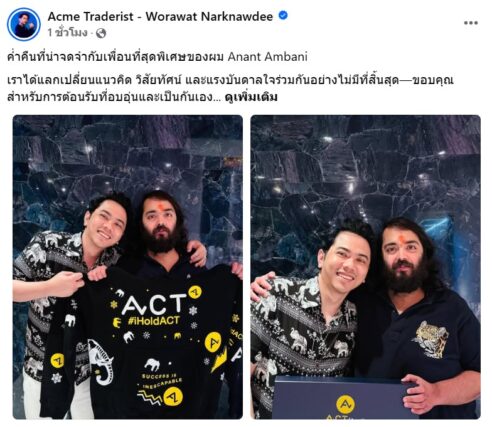 โดยในภาพที่ แอ็คมี่-DoubleDeep ได้โพสต์ลงเพจไปนั้น เป็นภาพของ แอ็คมี่ ใส่เสื้อลายช้างไทย ยืนกอดคออย่างแนบแน่นกับ อนันต์ อัมบานี และมอบเสื้อฮู้ด #iHoldACT ลายช้างเผือกสุดเท่เป็นซอฟต์เพาเวอร์ของไทยที่มีเพียงตัวเดียวในโลก เพื่อของขวัญสุดพิเศษและถือเป็นสัญลักษณ์แห่งมิตรภาพในการพบกันครั้งนี้อีกด้วย แต่ที่พิเศษกว่านั้นนั่นคือในคลิปที่โพสต์นี้ตัวของ อนันต์ อัมบานี ได้กล่าวชื่นชมและอวยพรให้ แอ็คมี่ ประสบกับความสำเร็จในธุรกิจทุกสิ่งอย่างในโลกนี้อีกด้วย