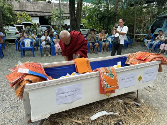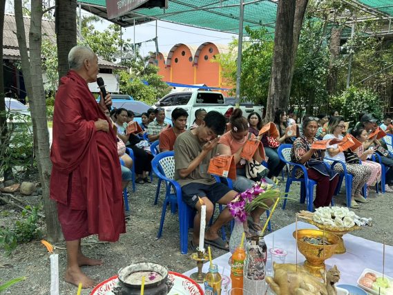 ทางวัดได้จัดตั้งอาหารคาวหวานเครื่องดื่ม และ จัดพิธีเผาโลงศพ โดยมีการเขียนชื่อคนเป็นอุทิศให้คนตาย รวมทั้งรายชื่อของบรรพบุรุษที่ล่วงลับ บรรจุใส่ลงในโลงศพเพื่อประกอบพิธีบังสกุลเป็นบังสกุลตาย จากนั้นนำรายชื่อที่สาธุชนได้เขียนบรรจุลงใส่ในโลงศพ โดยมีพระสงฆ์สวดบังสกุลอุทิศให้กับผู้ที่ล่วงลับ เพื่อให้ดวงวิญญาณของบรรพบุรุษได้รับส่วนบุญส่วนกุศล นอกจากนี้แล้วทางวัดได้เขียนบนแผ่นกระดาษติดไว้บริเวณข้างโรงศพว่าขออุทิศให้กับผู้เสียชีวิตจากเหตุแผ่นดินไหวที่ตึก สตง.เพื่อไว้อาลัย และส่งบุญกุศลให้กับผู้ที่ล่วงลับ มีการประชุมเพลิงวางดอกไม้จันทน์ เผากระดาษเงินกระดาษทอง ก่อนจะจำลองเหตุการณ์เผาโลงศพอุทิศส่วนบุญให้ดวงวิญญาณโดยมีสาธุชน จำนวนมากร่วมในพิธี