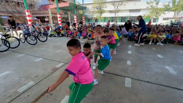 โดยภายในการจัดงานนอกจากจะมีการจัดแจกจ่ายขนมและอุปกรณ์การเรียนแบบไม่อั้นแล้ว ยังมีการจัดการเล่นและกีฬาเพื่อสร้างความสามัคคีและเสริมการพัฒนา เช่นการแข่งขันชักเย่อ แบบทีมของนักเรียนในห้องเรียนและชั้น ส่วนทีมเข้ามาร่วมแข่งขันกันอย่างคึกคักเรียกเสียงเฮได้ลั่นสนามหน้าโรงเรียน