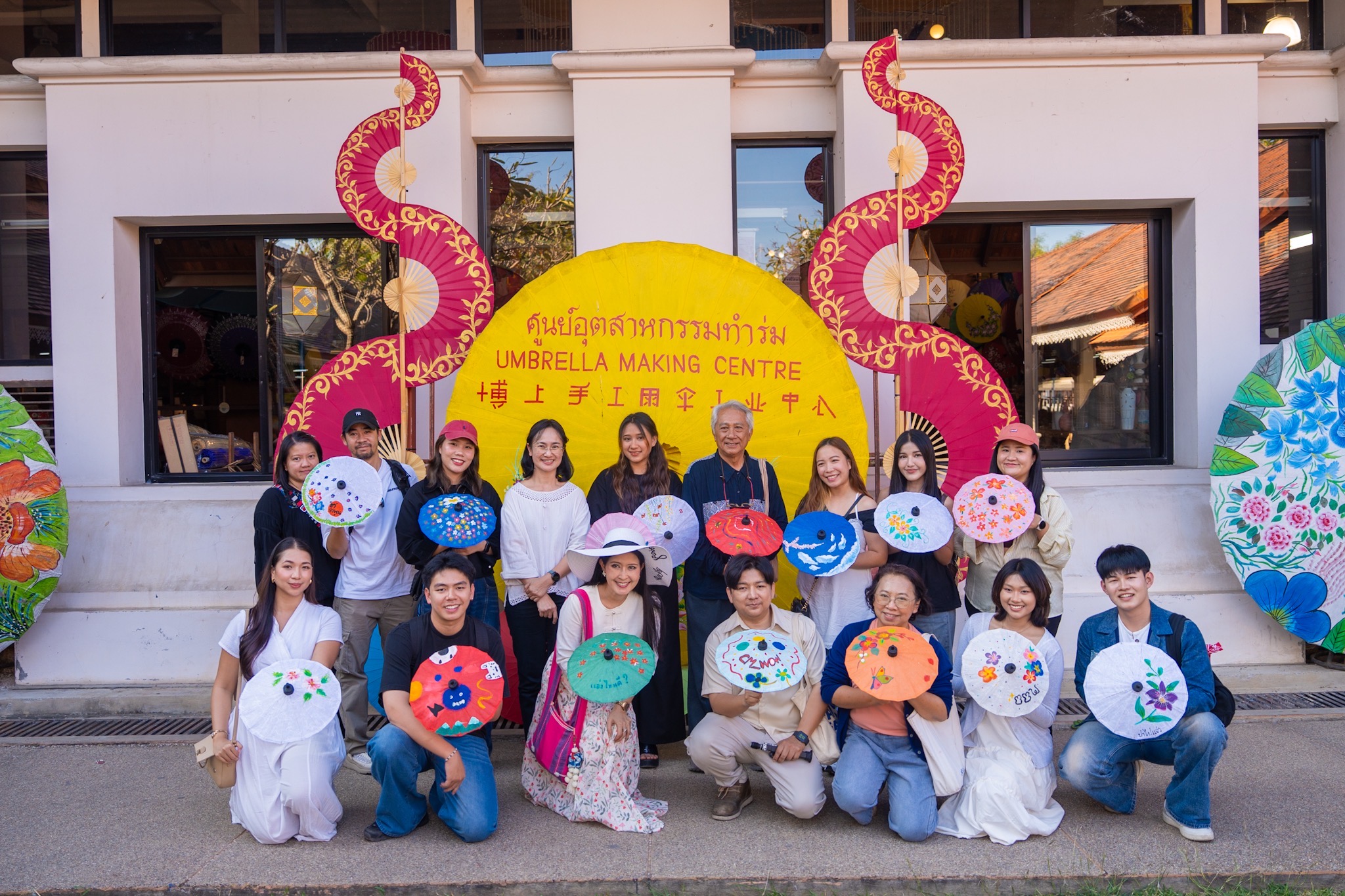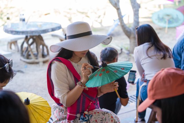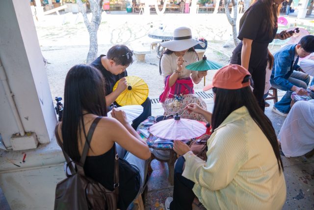 เดินทางเยี่ยมชมและทํากิจกรรม Workshop ระบายสีร่มที่ โหม้งต้นเปา ศูนย์สาธิตการทําร่มกระดาษสาตามแบบภูมิปัญญาดั้งเดิม แหล่งผลิตที่มีชื่อเสียงและสืบทอดองค์ความรู้ท้องถิ่นมาอย่างยาวนาน ภายในโหม้งเปิดให้สัมผัสทุกขั้นตอนการผลิตอย่างใกล้ชิด ตั้งแต่การเตรียมไม้ไผ่ การขึ้นโครงร่ม การขึงกระดาษสาที่ประณีต ไปจนถึงการแต่งแต้มลวดลายด้วยมือ เปิดโอกาสให้ผู้มาเยือนได้ถ่ายทอดจินตนาการลงบนชิ้นงานที่เป็นเอกลักษณ์หนึ่งเดียว