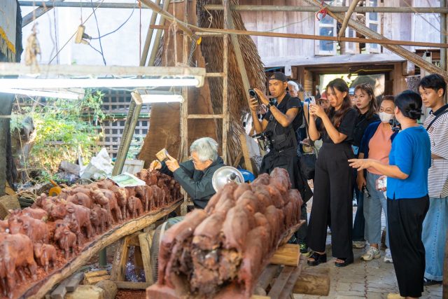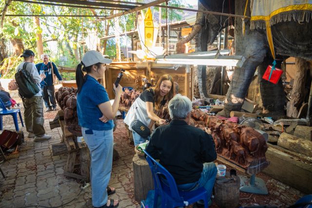 ต่อด้วยการเยี่ยมชม บ้านจ๊างนัก โหม้งบวกค้าง ชุมปฏิมากรรมไม้แกะสลักที่รวบรวมสุดยอดงานแกะสลักช้างอันโดดเด่น รังสรรค์โดยช่างฝีมือเอกที่มีความรักในศิลปะการแกะสลักไม้แบบล้านนา พื้นที่แห่งนี้ไม่ใช่เพียงที่จัดแสดงงานศิลป์ แต่เป็นศูนย์รวมภูมิปัญญาที่สืบทอดจากครูช่างสู่คนรุ่นใหม่ เพื่อให้ผู้สนใจได้เรียนรู้กระบวนการคิด เทคนิคเชิงช่าง และเรื่องราวความผูกพันอันลึกซึ้งระหว่าง “ช้าง” กับวิถีวัฒนธรรมล้านนาที่ถูกถ่ายทอดผ่านเนื้องานอย่างวิจิตรบรรจง