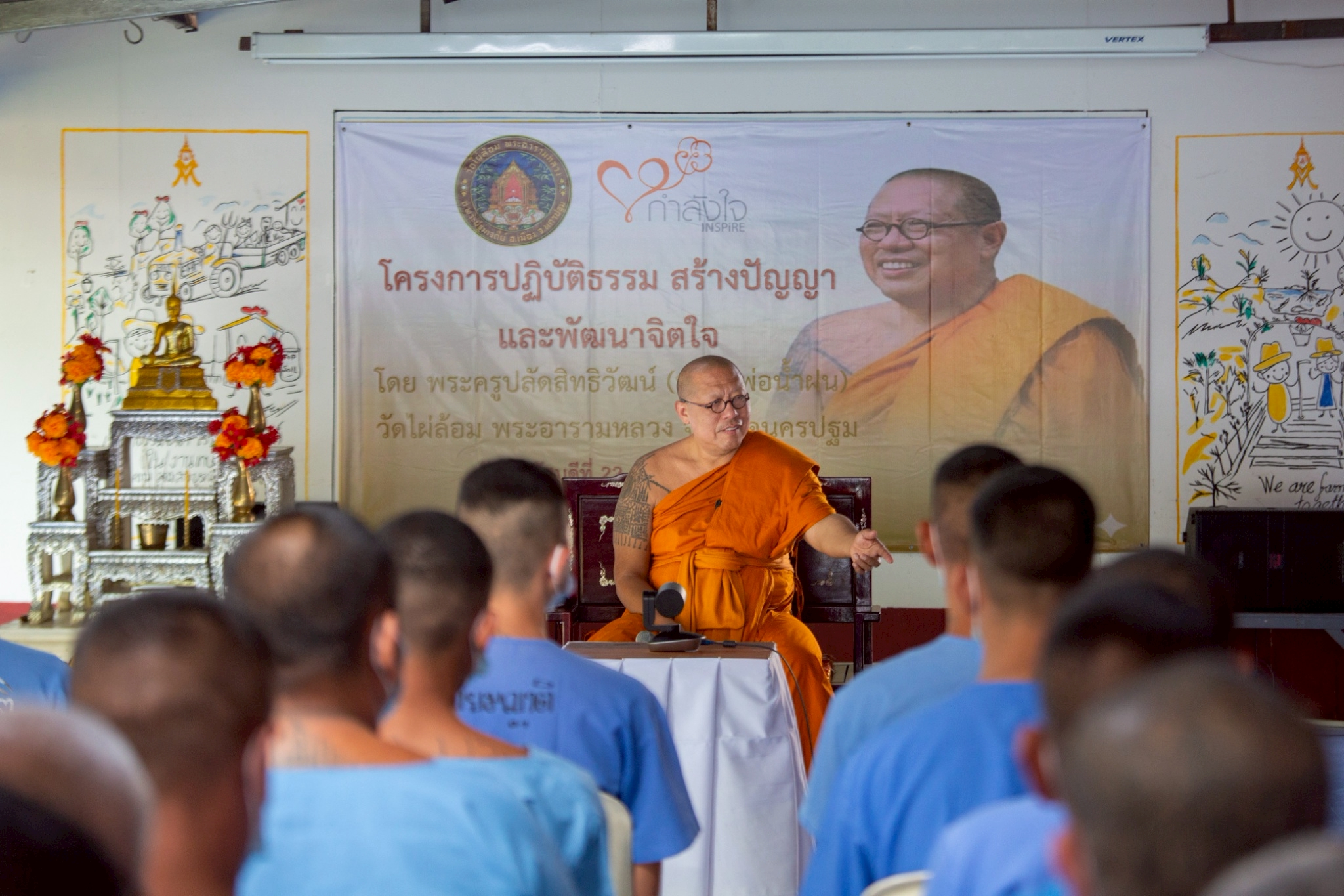 พระครูปลัดสิทธิวัฒน์ หลวงพี่น้ำฝน ผู้รักษาการแทนเจ้าอาวาสวัดไผ่ล้อมพระอารามหลวง จังหวัดนครปฐม พร้อมคณะสงฆ์ รับกิจนิมนต์ในการบรรยายธรรมด้วยแนวคิด “หลักธรรมแบบใหม่”ที่เน้นหลักสร้างปัญญาและพัฒนาจิตใจด้วยการ “คิด วิเคราะห์แยกแยะภายใต้เหตุผล” เข้ามาให้ความรู้ และยกระดับจิตใจกับผู้ต้องขังในเรือนจำโครงการกำลังใจฯ ซึ่งยังมีแนวทางในการสะท้อนถึงต้นเหตุของปัญหา การเกิดปัญหาและหาทางในการหลักธรรมมาปรับแก้จากปัญหานั้น โดยนำแนวทาง ศีล สมาธิ ปัญญา มาใช้เพื่อให้เห็นถึงหนทางแห่งการดับทุกข์ ในการดำเนินชีวิตในสถานที่จำกัดด้วยอิสรภาพ ซึ่งการบรรยายธรรมครั้งนี้เป็นจุดเริ่มต้นของกิจกรรรมซึ่งจะมีการจัดขึ้น
