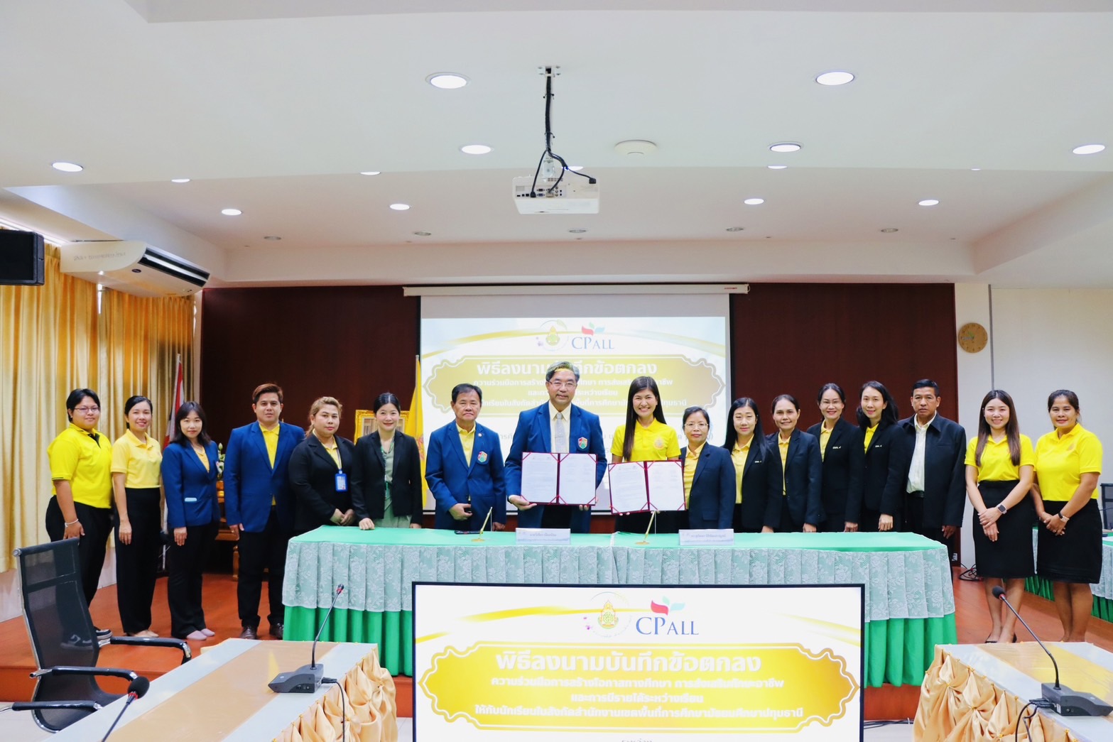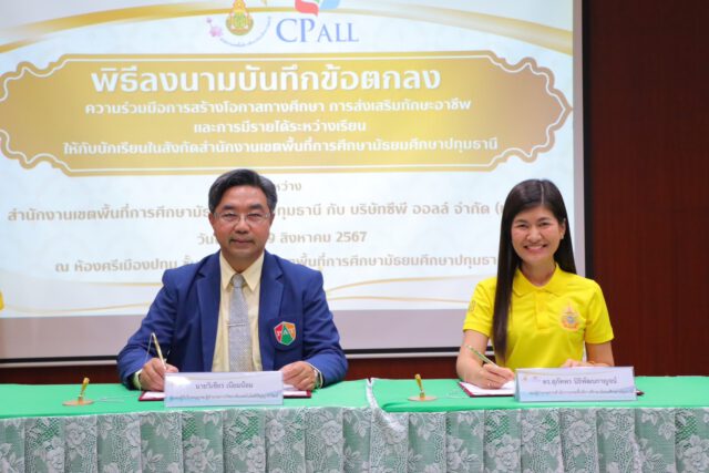 นายวิเชียร เนียมน้อม ผู้แทนผู้รับใบอนุญาตและผู้อำนวยการวิทยาลัยเทคโนโลยีปัญญาภิวัฒน์ และ ดร.รุ่งกานต์ สุขลิ้ม ผู้อำนวยการสำนักความร่วมมือ ร่วมกับ ดร.สุภัคพร นิธิพัฒนกาญจน์ รองผู้อำนวยการสำนักงานเขตพื้นที่การศึกษามัธยมศึกษาปทุมธานี จัดพิธีลงนามความร่วมมือ(MOU)การสร้างโอกาสทางการศึกษาในการแนะแนวการศึกษาต่อ การส่งเสริมทักษะอาชีพ และการมีรายได้ระหว่างเรียน โดยทำความร่วมมือกันระหว่างสำนักงานเขตพื้นที่การศึกษามัธยมศึกษาปทุมธานีกับบริษัทซีพีออลล์ จำกัด(มหาชน)และวิทยาลัยเทคโนโลยีปัญญาภิวัฒน์ ตามหลักการของพระราชบัญญัติการศึกษาแห่งชาติ พุทธศักราช2542 ที่ให้ความสำคัญต่อการพัฒนาและส่งเสริมความร่วมมือระหว่างหน่วยงานการศึกษาภาครัฐและภาคเอกชน เพื่อให้การจัดการศึกษาเป็นไปอย่างมีประสิทธิภาพ สามารถผลิตกำลังคนที่มีคุณภาพ สอดคล้องกับความต้องการของสถานประกอบการ อีกทั้งสอดคล้องกับยุทธศาสตร์การพัฒนาประเทศในด้านการศึกษา ได้แก่ การพัฒนาหลักสูตร , การพัฒนาบุคลากร , การฝึกงานของนักเรียน นักศึกษา และการรับผู้สำเร็จการศึกษาเข้าทำงาน