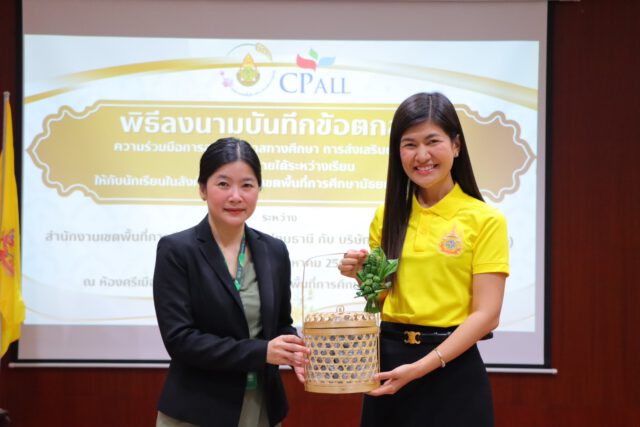 โอกาสนี้ ดร.สุภัคพร นิธิพัฒนกาญจน์ ได้กล่าวขอบคุณบริษัทซีพีออลล์โดยสำนักความร่วมมือและวิทยาลัยเทคโนโลยีปัญญาภิวัฒน์ที่สนับสนุนนโยบายการพัฒนาส่งเสริมทักษะอาชีพ เป็นการสร้างความร่วมมือและให้โอกาสทางการศึกษาแก่นักเรียนในสังกัดของสำนักงานเขตพื้นที่การศึกษามัธยมศึกษาปทุมธานีได้มีทางเลือกในการศึกษาต่อด้านทักษะอาชีพและการมีรายได้ระหว่างเรียน เป็นการผนึกกำลังเพื่อพัฒนาและผลิตกำลังคนที่มีประสิทธิภาพอย่างเป็นระบบและต่อเนื่อง หวังเป็นอย่างยิ่งว่าการทำบันทึกข้อตกลงความร่วมมือนี้จะเป็นประโยชน์ต่อนักเรียนในสังกัดสำนักงานเขตพื้นที่การศึกษามัธยมศึกษาปทุมธานีได้อย่างแท้จริง